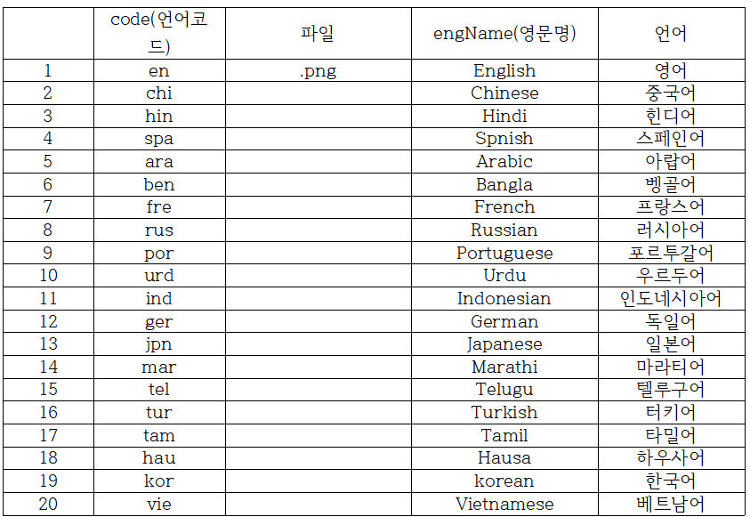 언어코드, 국가명, 그리고 해당 국가 사진파일을 db에 넣을때 사용 할거라고 하니.. 급하게 작동만 되게 뚝딱 만들었다.