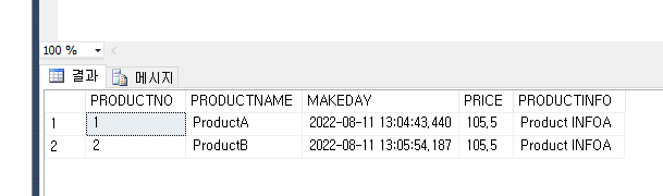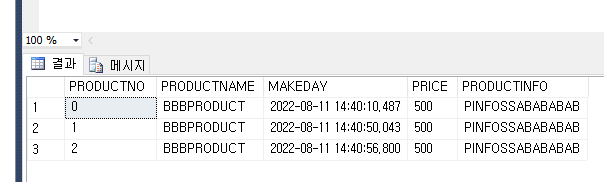 결과는 아래와같다. PRODUCTNO가 증가하는게 보인다!