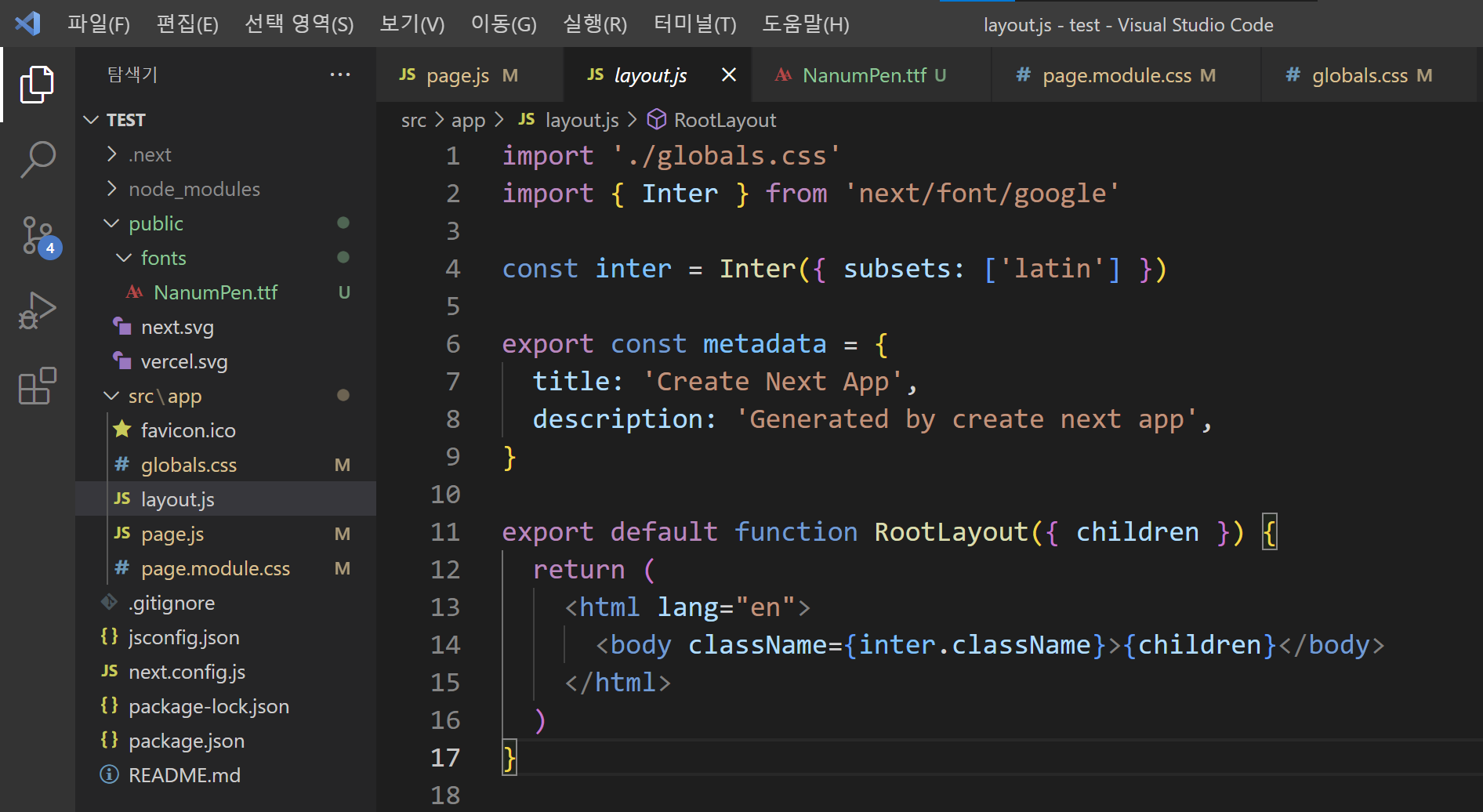 3.layout.js는 아래와 같이 수정해준다. 사용하지 않는 inter모두 주석해줘도 되지만 우선 테스만 해보기위해