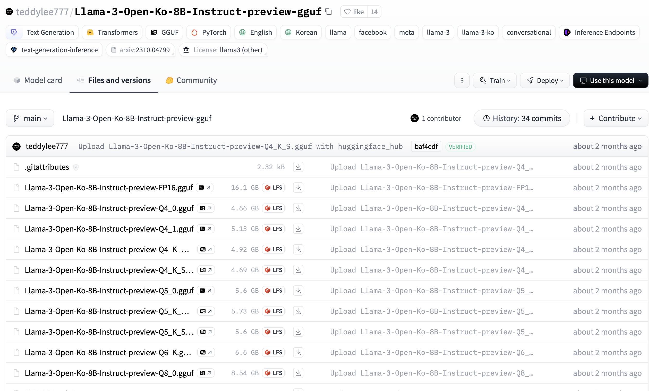 대표적으로 이 두개가 있는데 아래것을 사용해보도록하자. 왜냐하면 .gguf 확장자로 되어있어야 어케저케해서 모델로 잘 만드는데