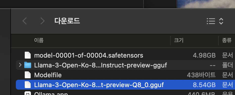 아래와같이 다운로드 받아지면 Modelfile을 하나 만들어주면된다. 이 모델파일이 다른게 아니라 확장자도 없고 그냥 Modelfile이다