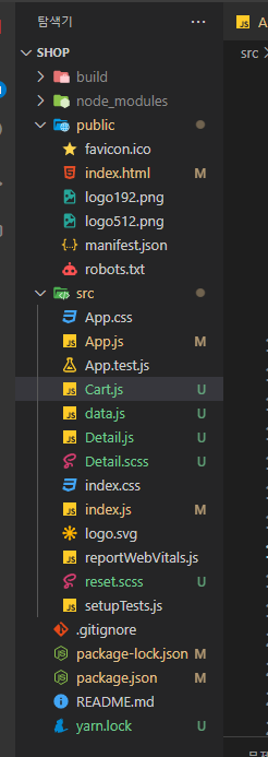 이와같은 구성에서 App.js와 index.js를 기본으로 여러 컴포넌트들을 만들어준다.