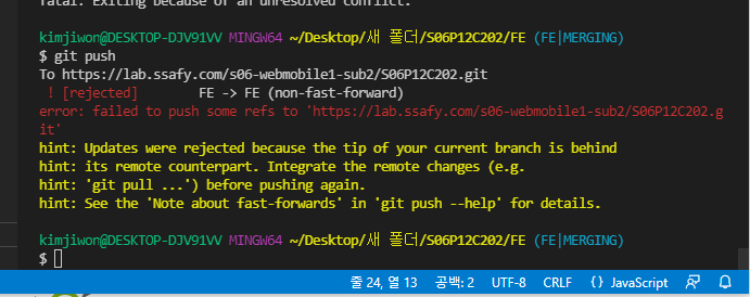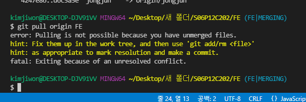 FE 브랜치로 kimjiwon 브랜치를 머지하려는순간 오류가났다